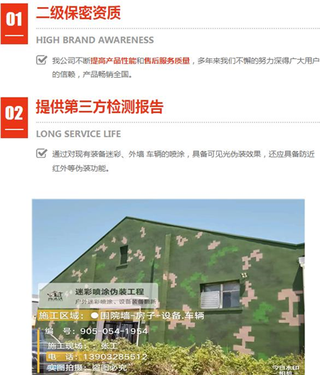 多年經驗偽裝波段范圍:可見光(380nm~760nm)和近紅外(760nm~1200nm); 外墻迷彩漆不是水漆。盡管水漆是一種環(huán)保型的涂料,;